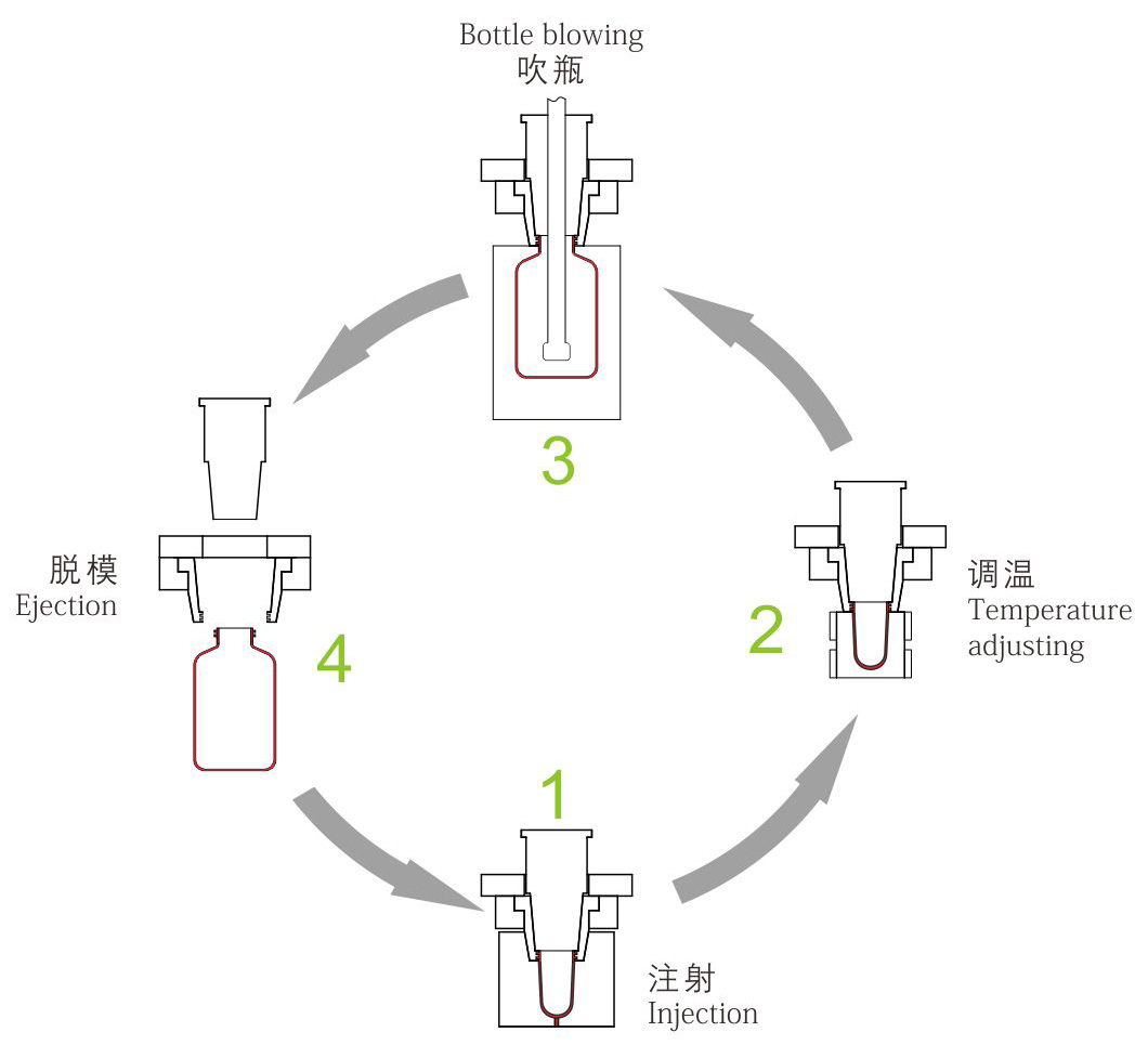 ·轉(zhuǎn)盤上均布注射、調(diào)溫、拉吹、脫模四個工位,同時進行注射成型、瓶胚調(diào)溫、拉吹成型、制品脫模四個工藝,實現(xiàn)一步法注拉吹成型。