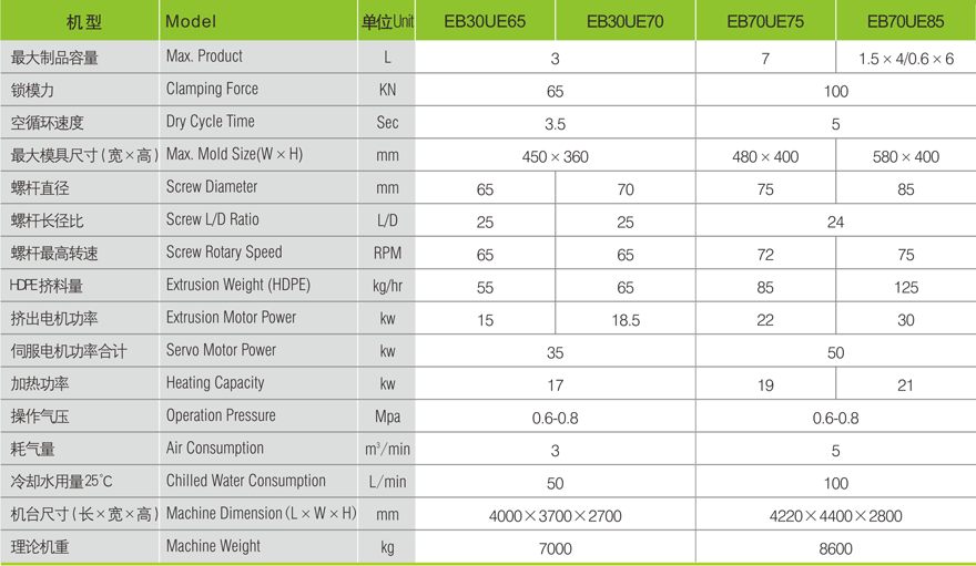 ·全機八個機械動作(移模、合模、插筆、抬頭及伺服壁厚)均由獨立的伺服電機精密控制、驅動,按需輸出直接把電能轉換成機器動作的機械能,相比傳統(tǒng)氣動/液壓擠吹機,在動作部分節(jié)能約70%。